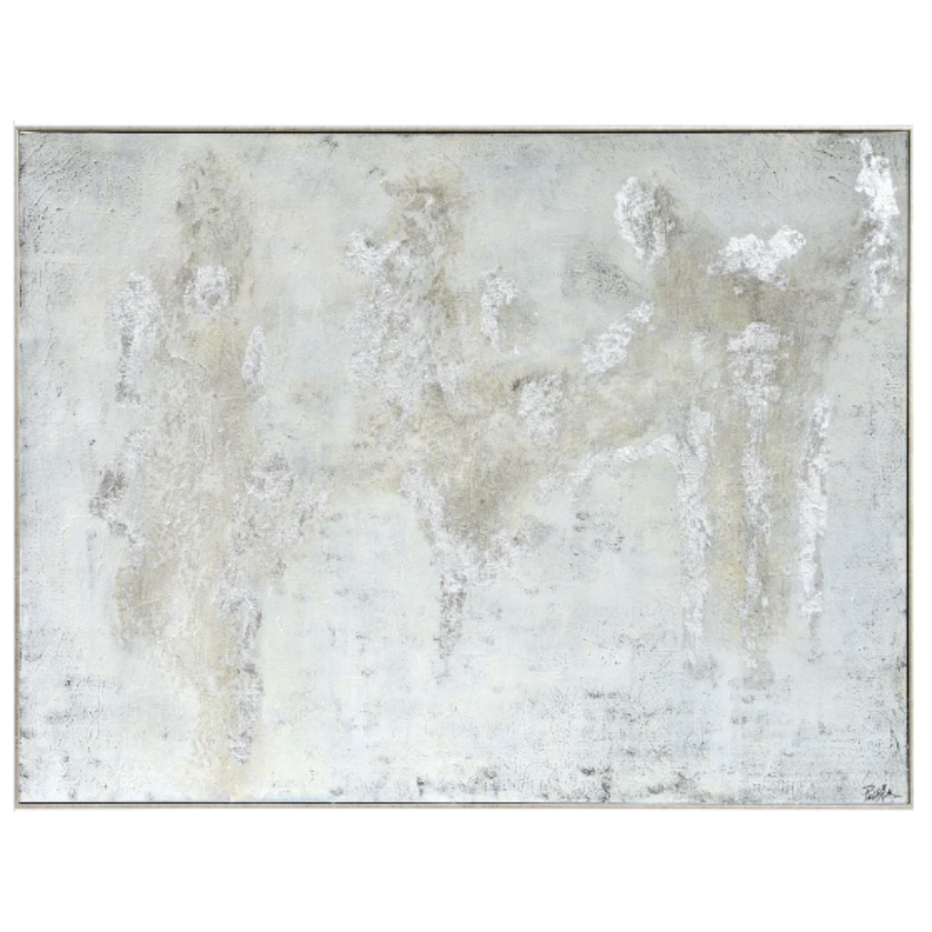 A soft, abstract canvas in layers of off-white, pale gray, and sand tones. The Devonshire Canvas has subtle vertical forms and textured surfaces - creating a calm, atmospheric feel, with hints of metallic white adding depth and quiet movement.