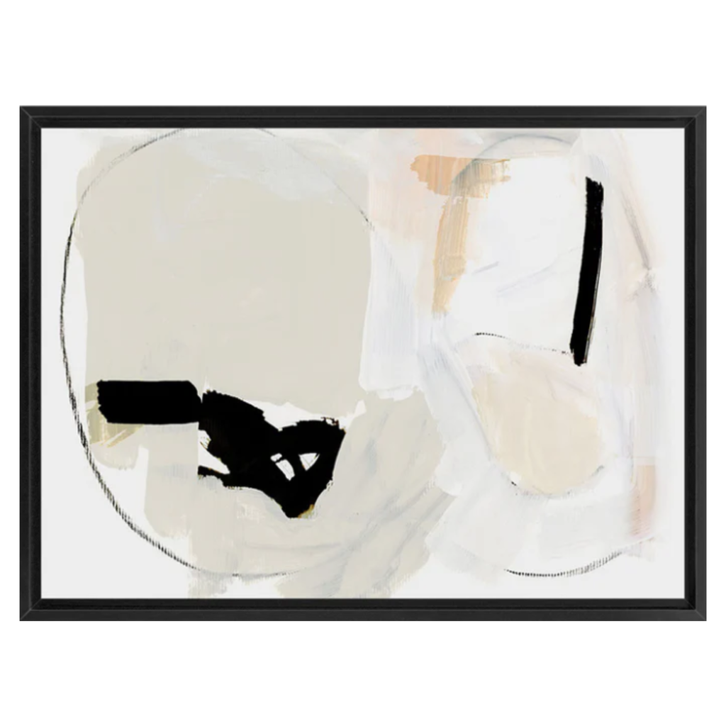 A modern abstract artwork featuring soft, layered brushstrokes in warm neutrals: ivory, beige, and muted sand, balanced by bold black accents. Organic, rounded forms overlap and dissolve into one another, creating a sense of calm movement and spaciousness. Framed in a sleek black floating frame, the piece feels both minimalistic and expressive, making it well suited for modern, Scandinavian, or neutral interiors.