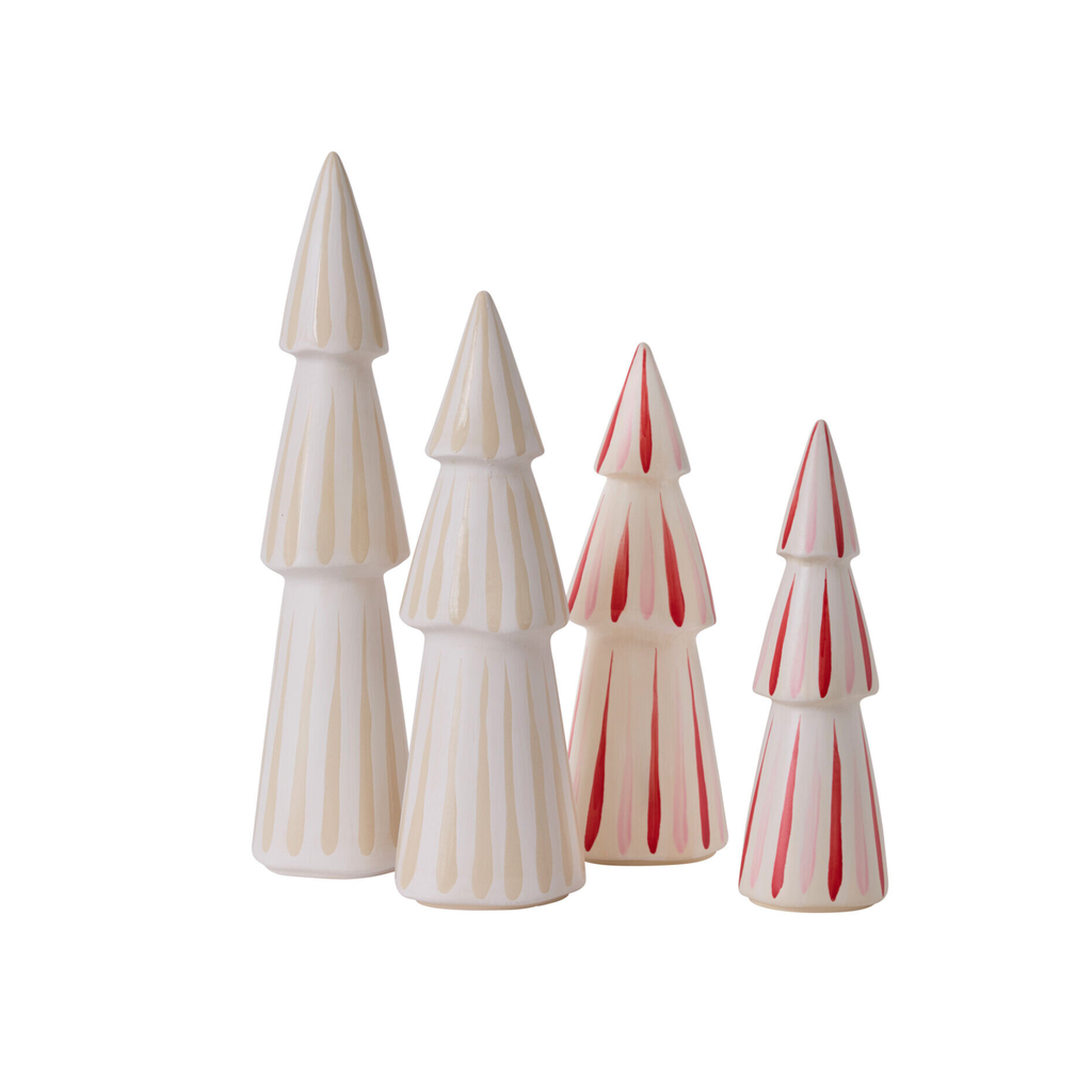 These playful ceramic Christmas trees bring a charming, handcrafted touch to seasonal décor. Featuring a natural white clay base accented with hand-painted red and white stripes, each piece celebrates festive whimsy with an artisanal feel. A delightful decorative accent that adds warmth, character, and holiday cheer to shelves, mantels, or tabletop displays.