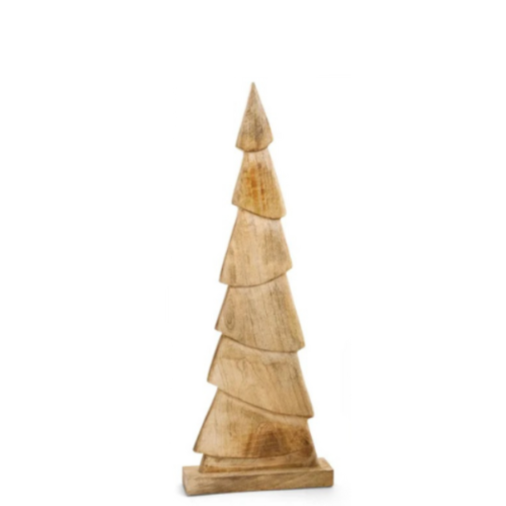 A beautifully crafted natural wood Christmas tree, featuring understated, simple carvings that celebrate the beauty of its organic texture. Its minimalist design exudes rustic charm and timeless elegance, making it a versatile piece that adds warmth and a touch of nature to any holiday décor.