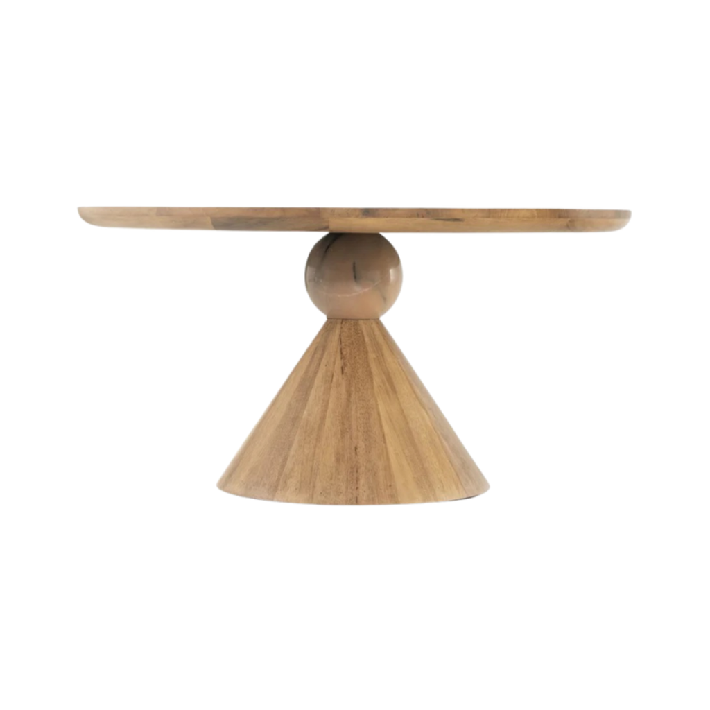 A sculptural showstopper inspired by Italian design. Finished in a smoked honey, a cone-tapered parawood base supports a rounded tabletop separated by blush-finished marble detailing. Seats four comfortably.