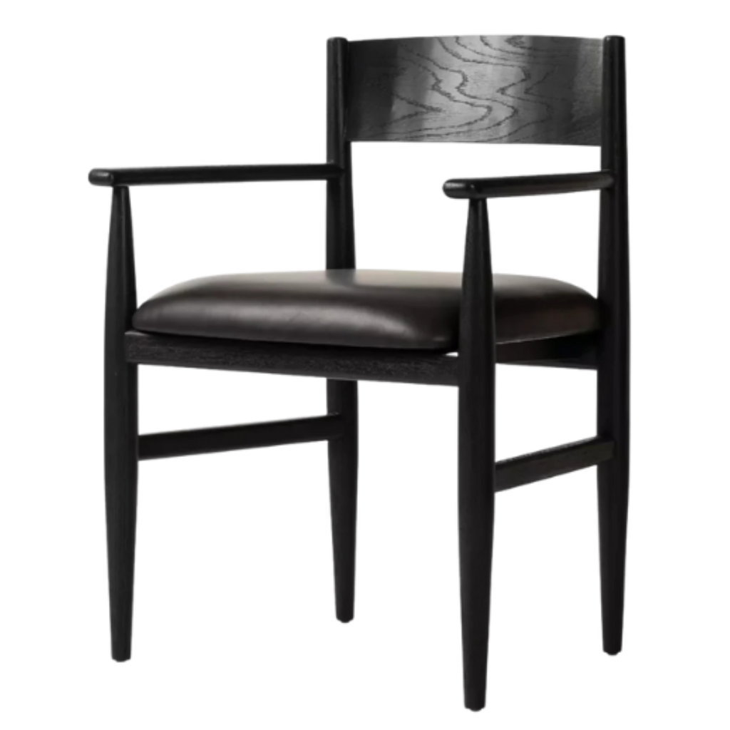 Classic midcentury form meets monochromatic comfort. The tapered-leg design of this oak dining armchair is finished with an espresso-brown upholstered cushion for a sleek, inviting seat.