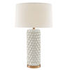 Intricate hand-formed ceramic flower petals cover the surface of the Calla Lily Table Lamp. The textural interest of the petal-covered column is heightened by the antique brushed-brass accents. The white lamp is topped with an eggshell shantung shade that completes this pretty composition.