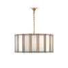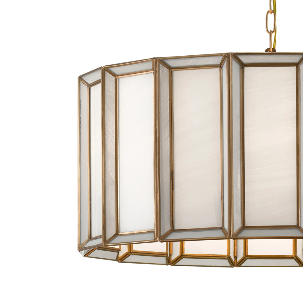 The Daze Pendant features curved panels of milk glass framed by elegant metal ribs in an antique brass finish. When illuminated, it casts a warm, luminous radiance that enhances any space.