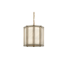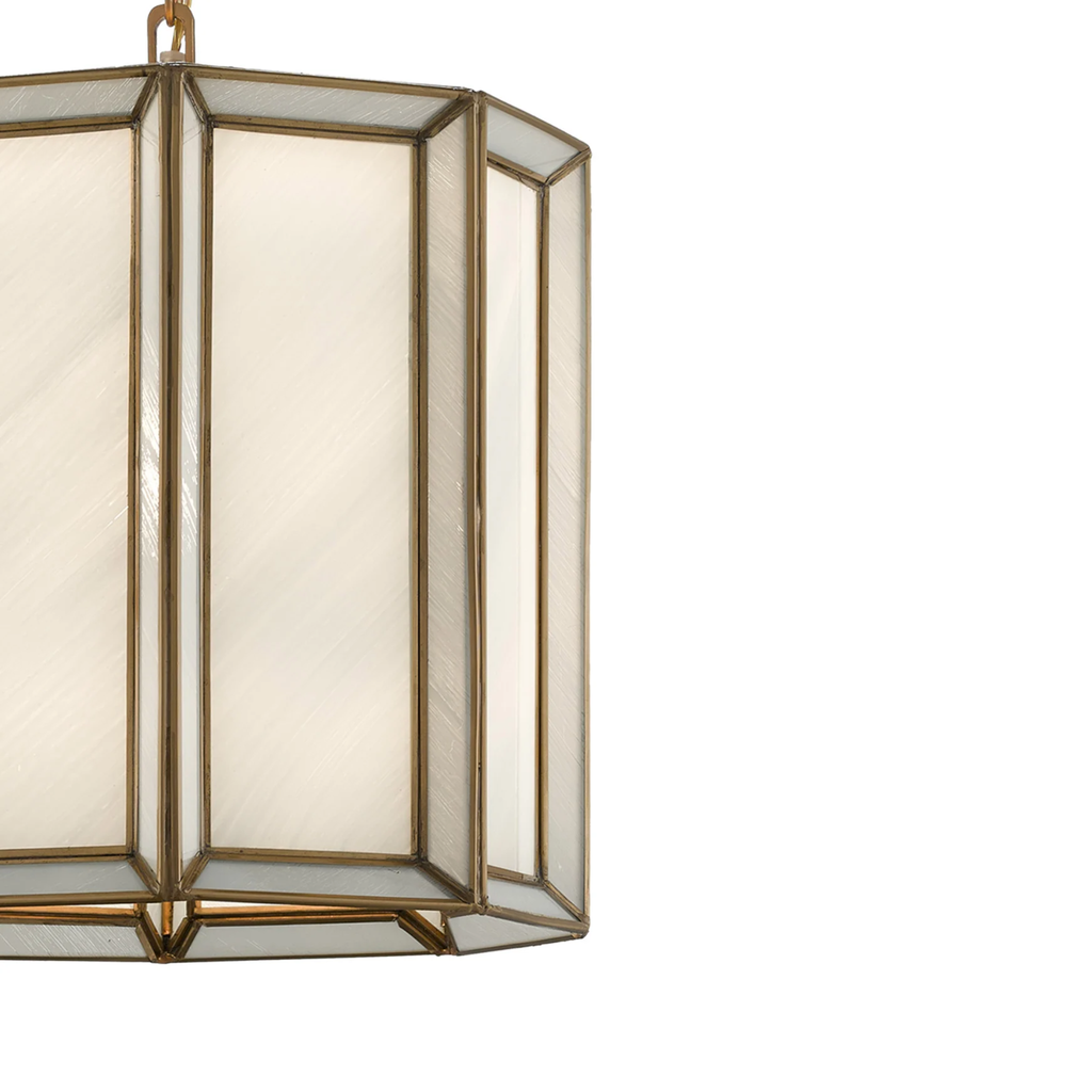 The Daze Pendant features curved panels of milk glass framed by elegant metal ribs in an antique brass finish. When illuminated, it casts a warm, luminous radiance that enhances any space.