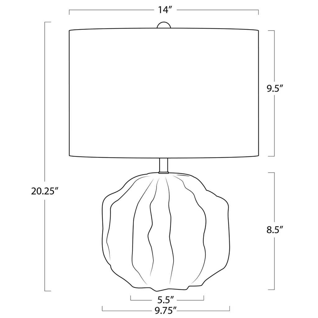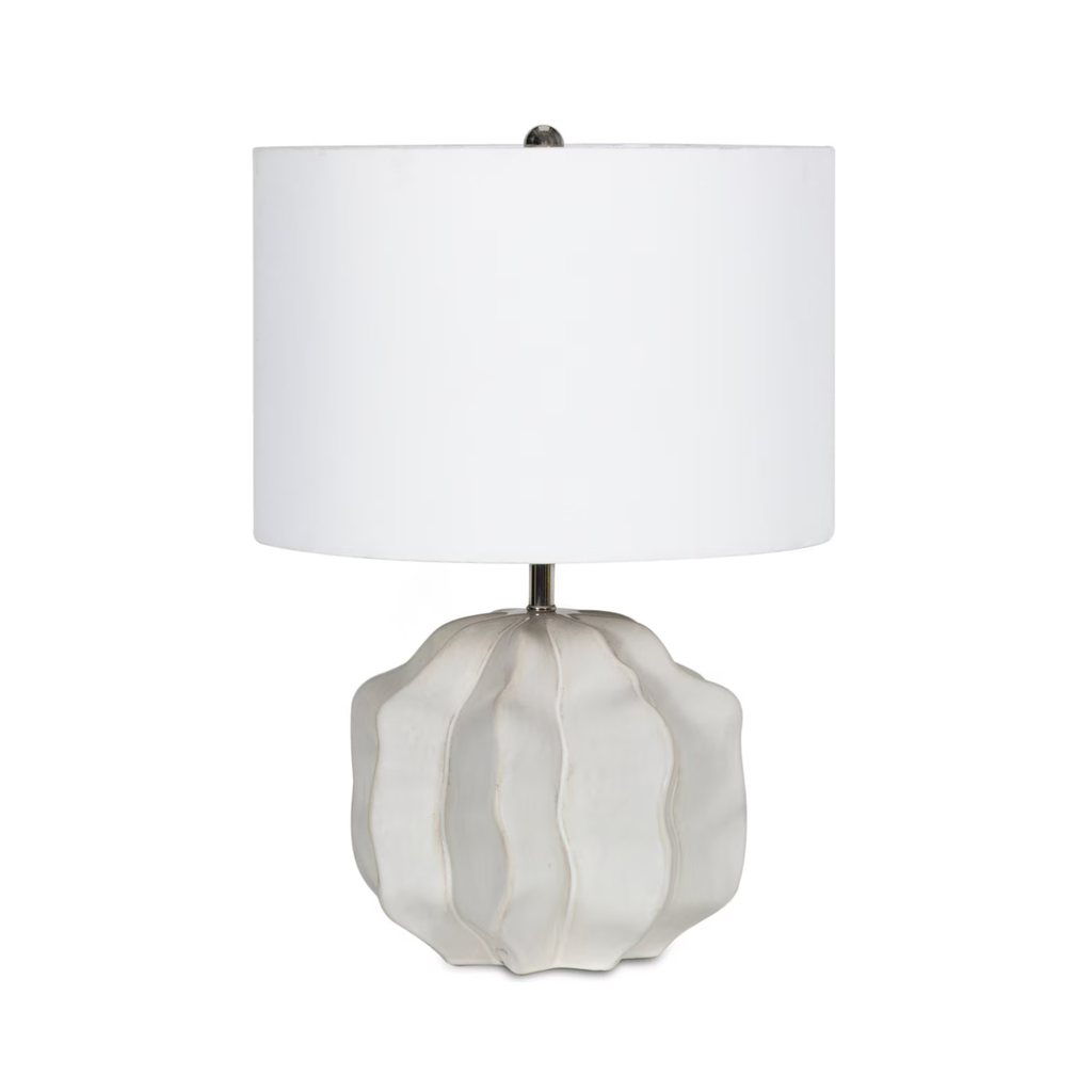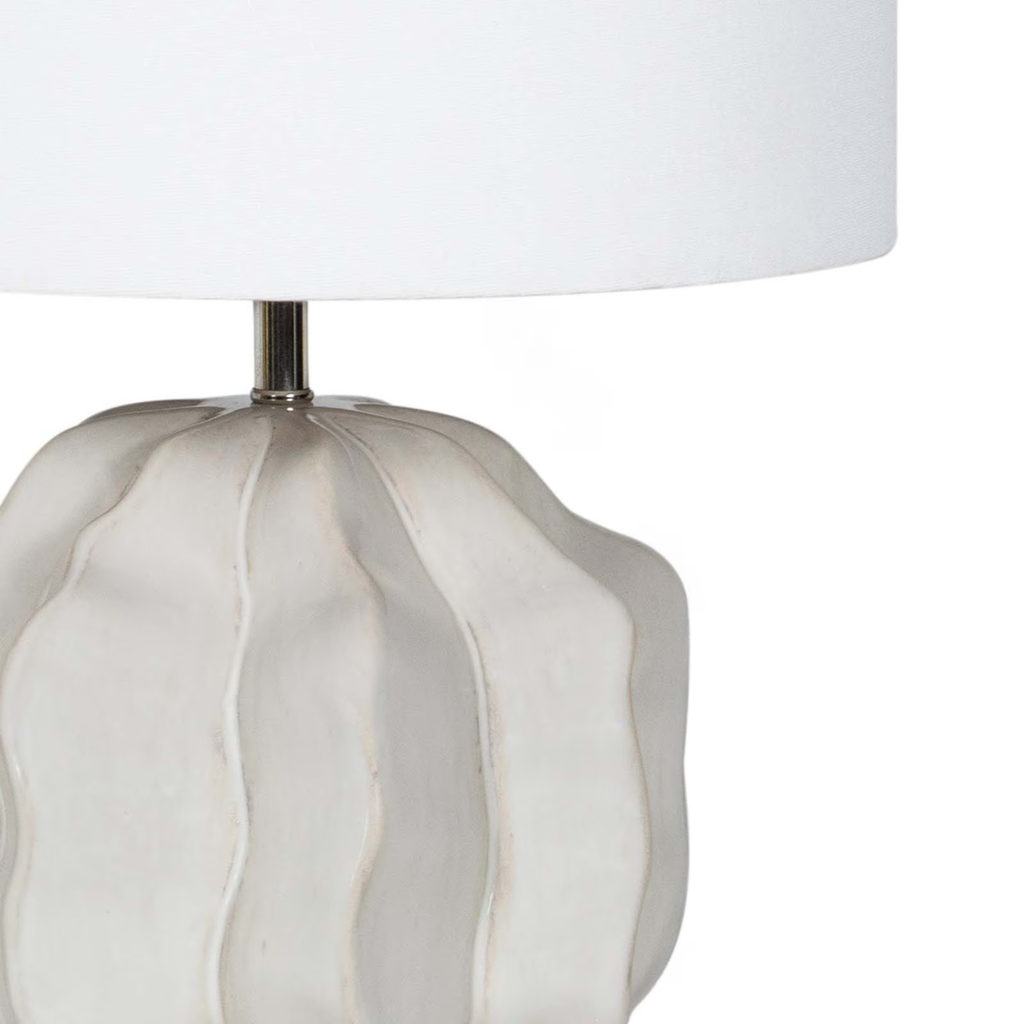 The Destin Ceramic Mini Lamp features a sculptural base with organic, flowing waves arranged in a refined geometric form, paired with a natural linen shade. Perfectly sized for layering light, it adds a warm glow to a cozy reading nook or an unexpected touch of charm to a coffee station or bookshelf.