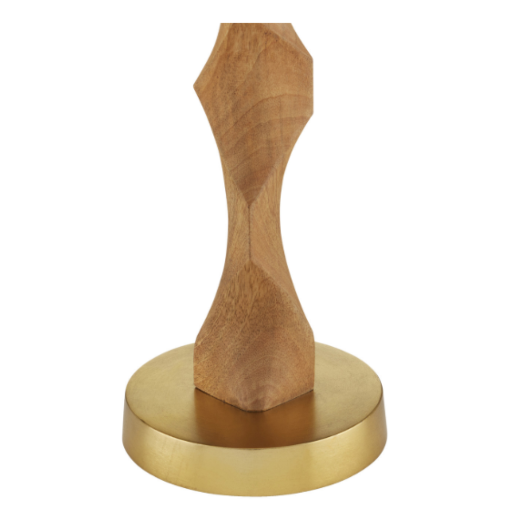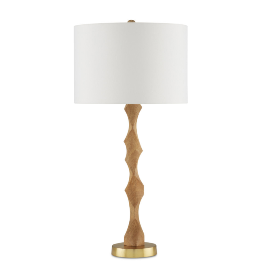 The Sunbird Wood Table Lamp showcases an undulating form masterfully carved from wood, achieved through a skilled process of rotating and shaping at precise angles to create both a smooth surface and natural knotted texture. Finished in a warm tan, the lamp rests on a brass-toned metal base and is crowned with an off-white shantung shade, resulting in a design that is both graceful and elegantly refined.