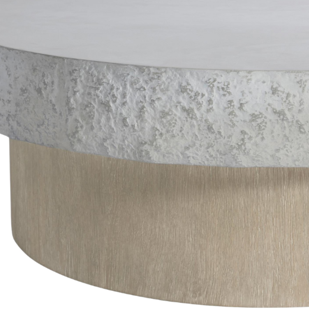 The Pincio cocktail table blends materials and organic shapes. A smooth faux stone top with textured edges rests on a round wirebrushed oak base, with the Millstone and Trevin finishes creating a naturally chic look.