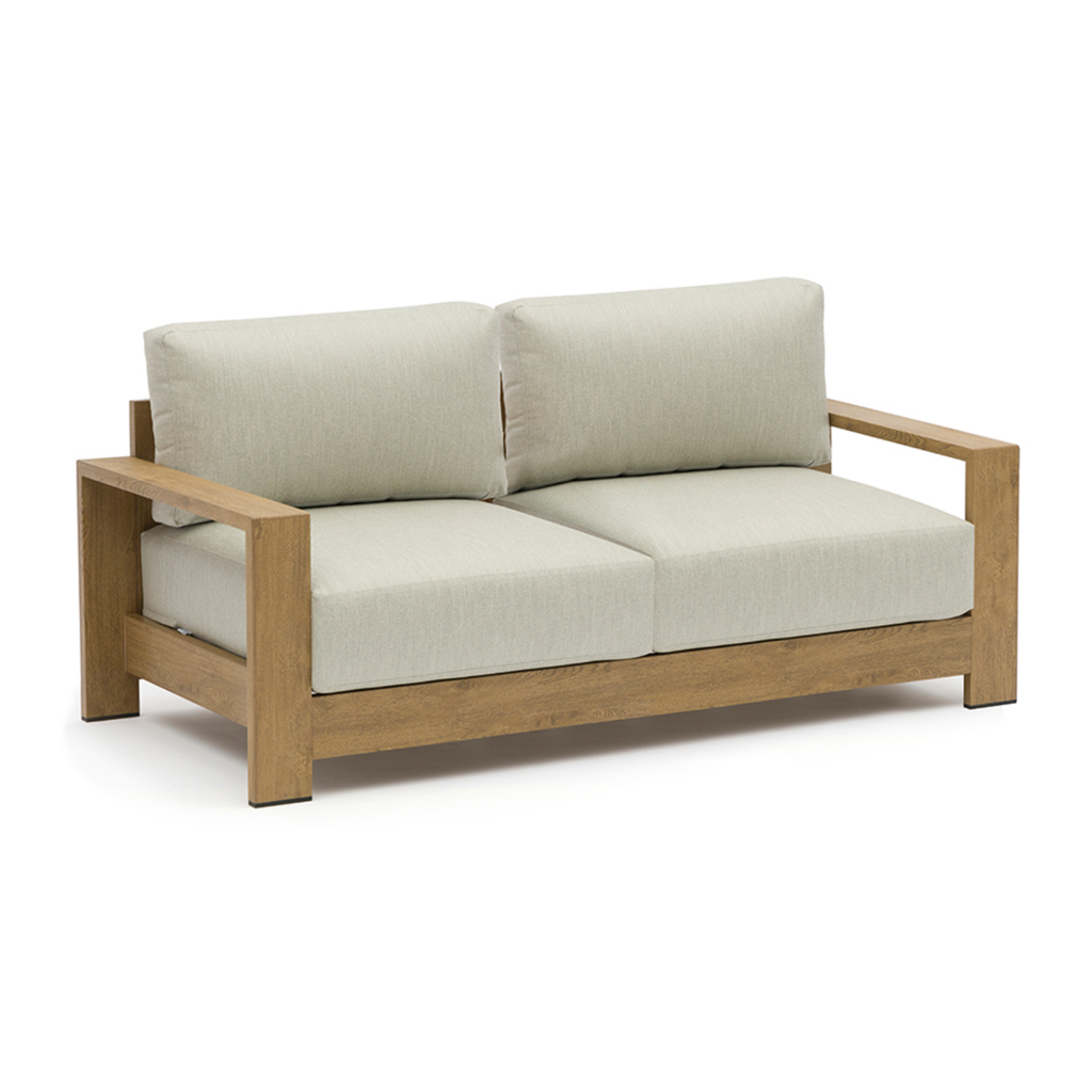 The Sky Sofa features a sleek aluminum frame with a natural oak finish, complemented by soft griege performance fabric seats. A perfect blend of elegance and comfort for any outdoor space.