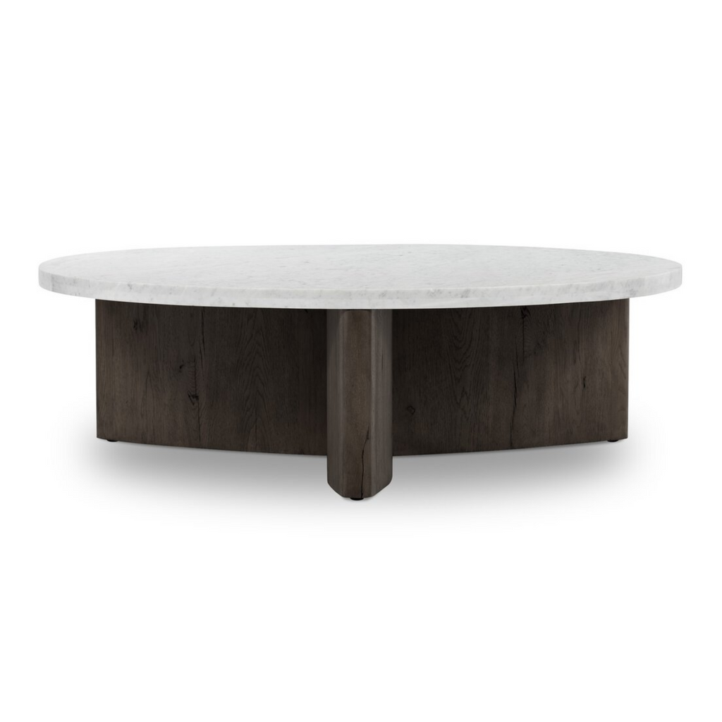 Mixed materials make the table. Thick-cut oak forms a chunky pedestal base for a rounded tabletop of white Italian marble, with beautifully subtle natural veining.